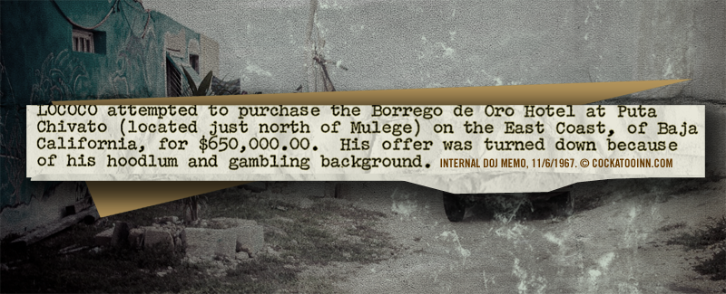 But Mexico was plenty corrupt, and that brings us to the crux of this story. According to an FBI informant, Andy Lococo tried to buy the Borrego de Oro outright for $650,000. His intention was to create some sort of hotel or casino, away from the regulations he faced in the States. He was rejected “because of his hoodlum and gambling background,” the report concluded.